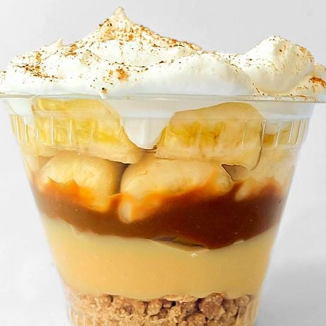 Farofa de bolacha, banana,doce de leite, chantily.