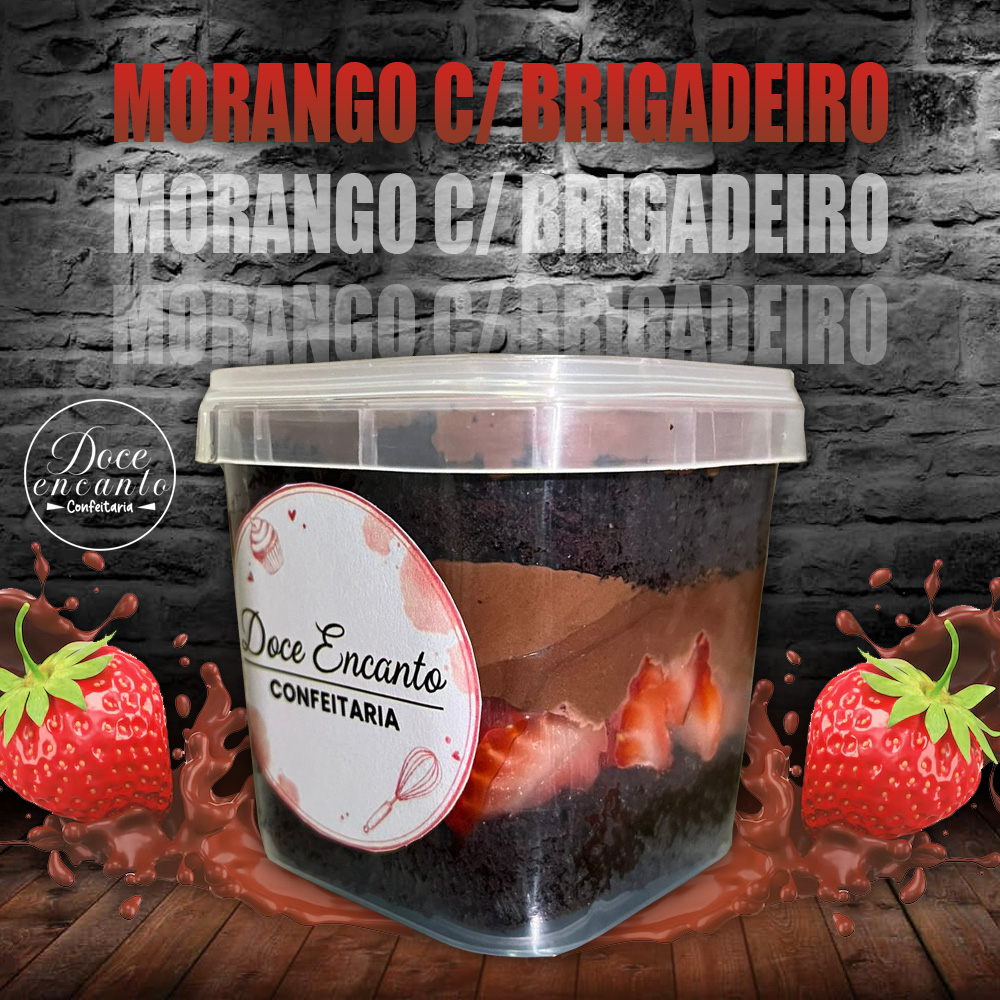 Delicoso bolo de Pote, Massa de Chocolate 70%, Morango Fresco, Creme de Chocolate 70%, Granulado Original.
