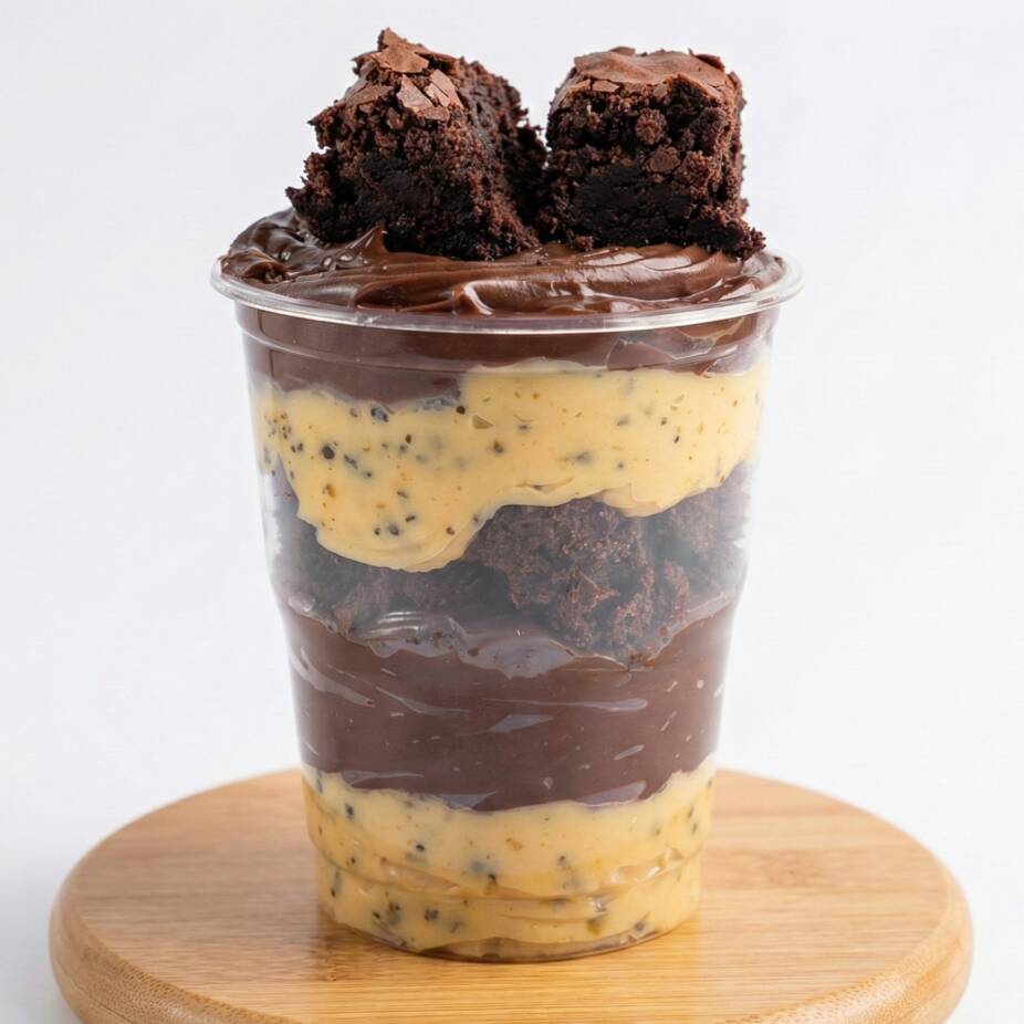 Um delicioso copo com, Creme de Ninho (Leite Ninho Original), Pedaços de Brownies, Creme de Chocolate 70%