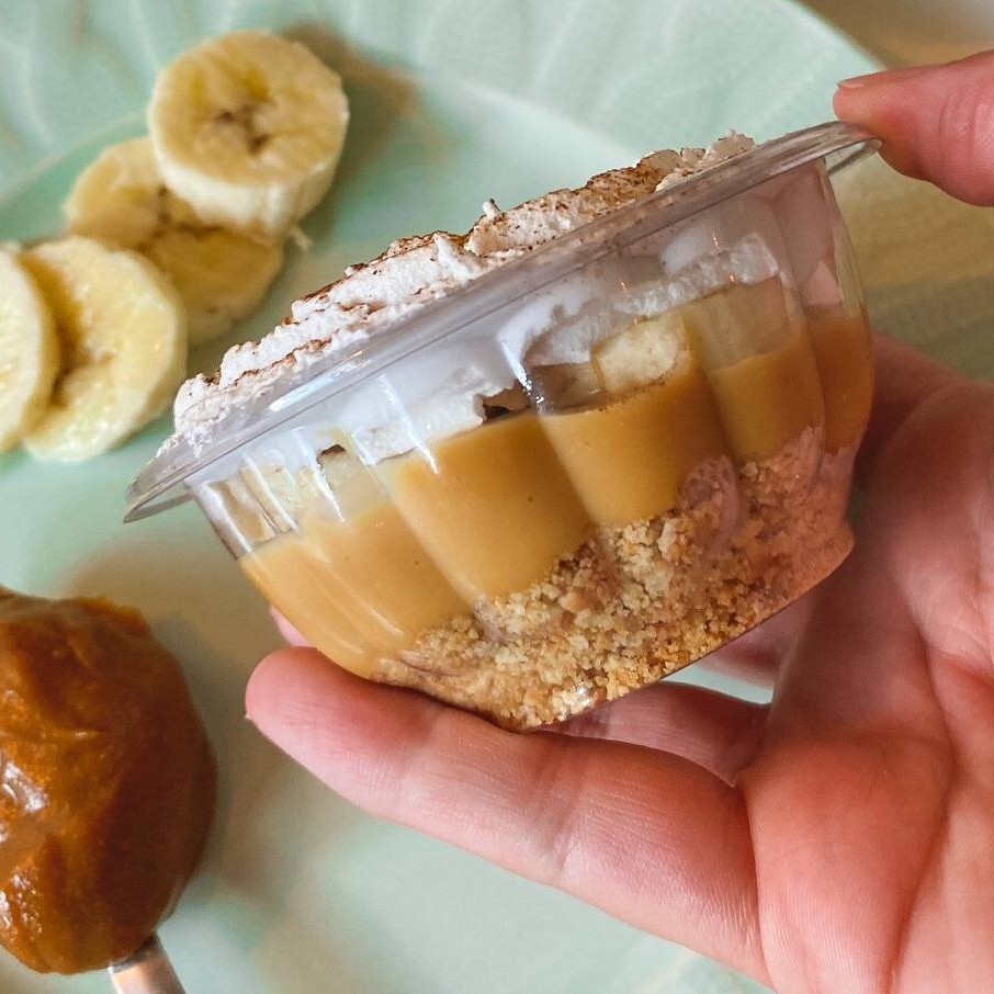 Nossa famosa Banoffe: farofa de biscoito amanteigado, doce de leite e bananas frescas, finalizado com delicioso chantilly e canela. 150ml Obs: não alteremos nem retiramos nenhum item