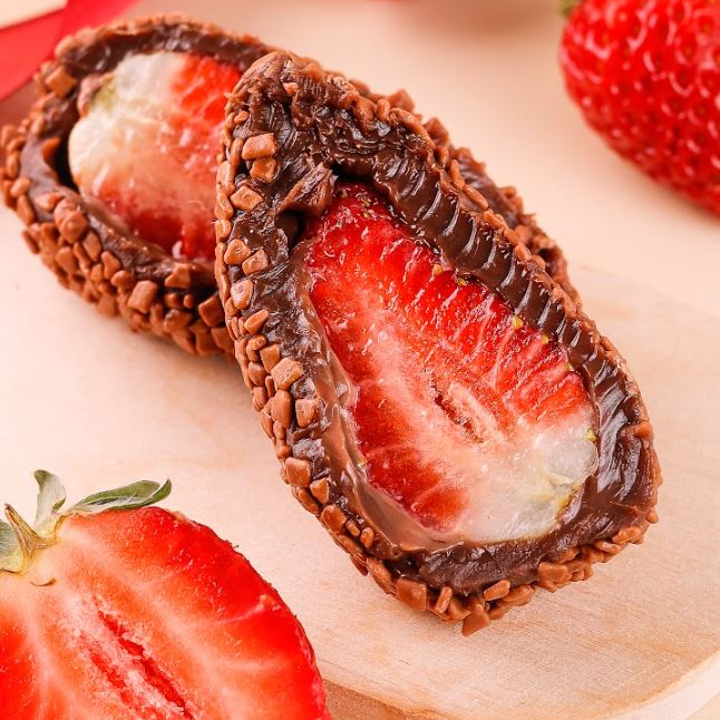 "Dos mesmos criadores do Morango do amor, chegou o delicioso bombom de morango. Morango fresquinho e selecionado, recheado com brigadeiro branco e banhado com chocolate delicioso. Você vai amar! Aprox 90g"