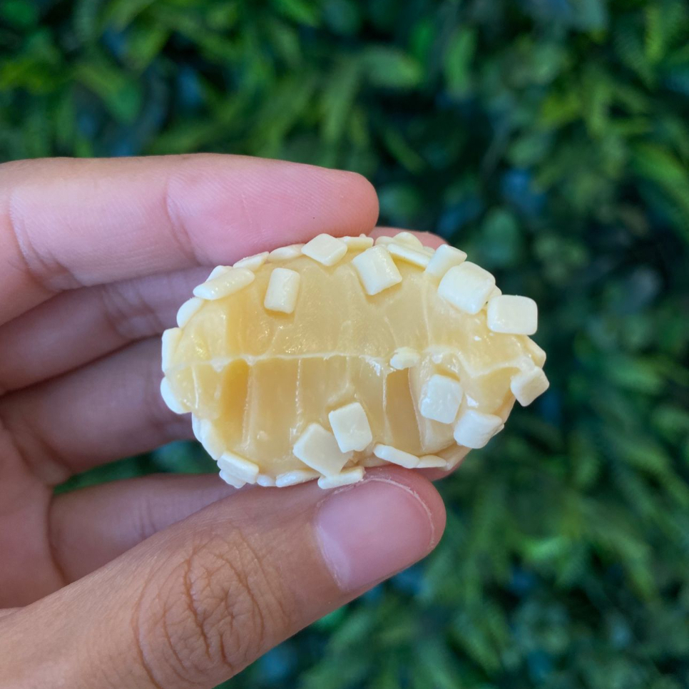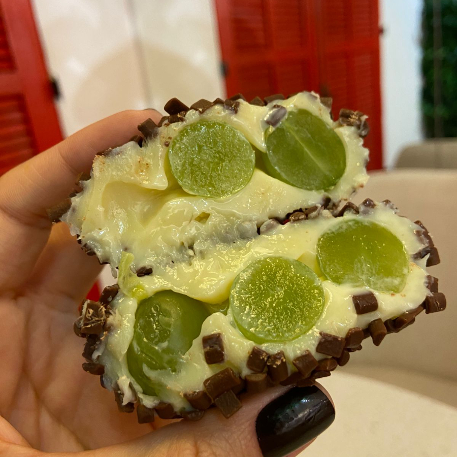 Delicioso brigadeiro branco, com 3 uvas verdes dentro, envolto com chocolate ao leite nobre. Você vai amar e vai pedir mais :)