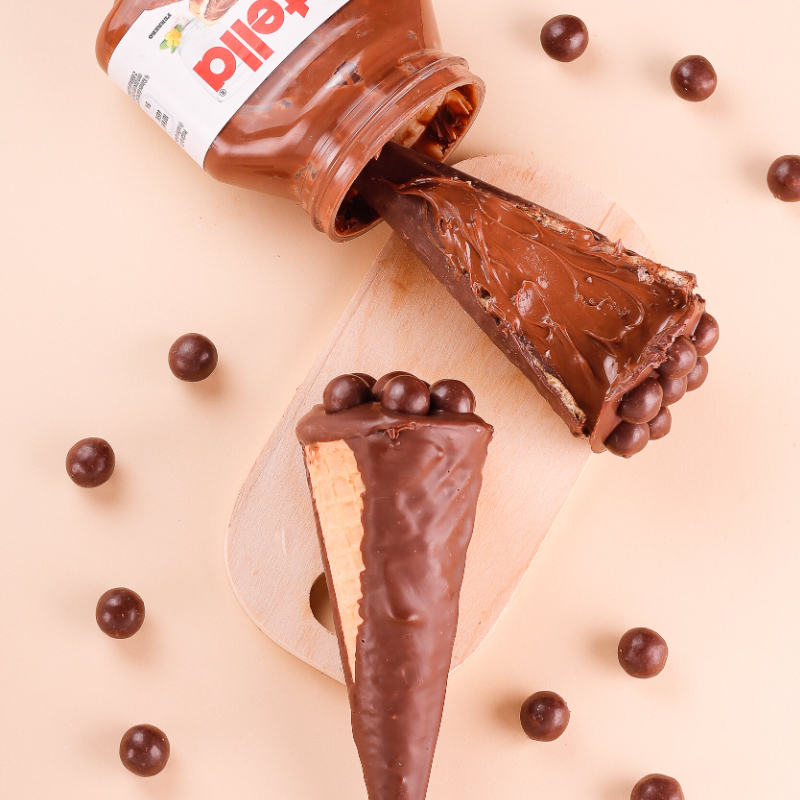 Ele é o bom! Muito famosinho e tão desejados pelos clientes, nosso Cone Trufado de Nutella tem a casquinha banhada de chocolate, por dentro e por fora, é todo preenchido por pura Nutella e finalizado com bolinhas chocobool. Você merece um Cone de Nutella todinho pra você. 80gr