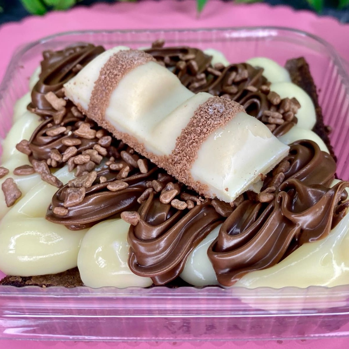 O Brownie Kinder Bueno é um deleite irresistível que certamente vai encantar o seu paladar. Este é, indiscutivelmente, o nosso campeão de pedidos! Ele é cuidadosamente preparado com um recheio incrivelmente cremoso de Leite Ninho e Nutella, conferindo uma combinação perfeita de sabores. A cada mordida, você experimenta a textura rica do brownie, complementada pela suavidade do Kinder Bueno. Este é um prato que não só satisfaz a sua vontade de um doce decadente, mas também eleva a sua experiência gastronômica a um novo patamar. Não perca a chance de degustar esta obra-prima da confeitaria!