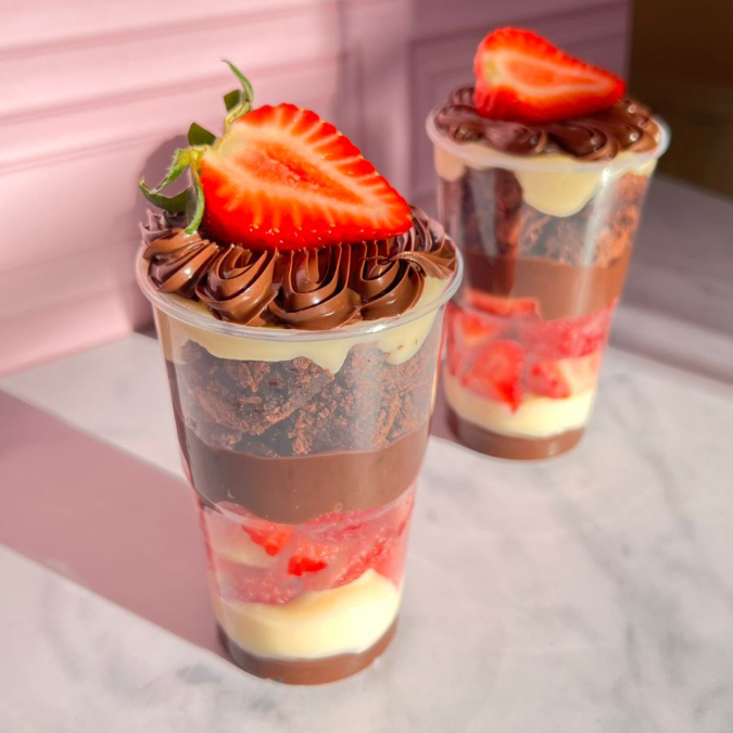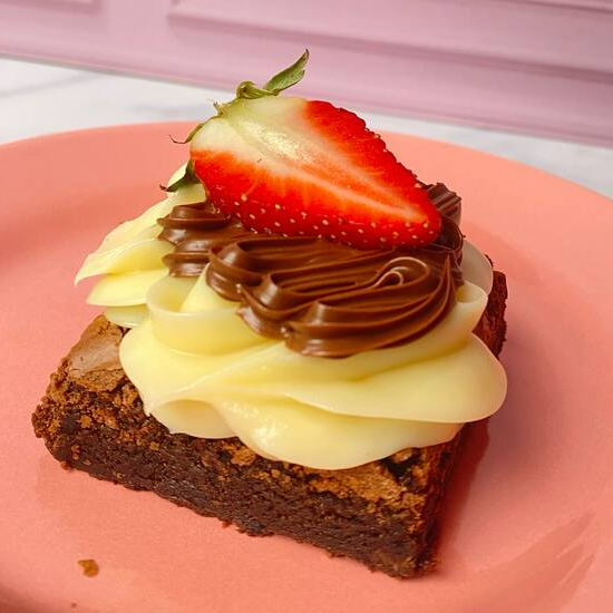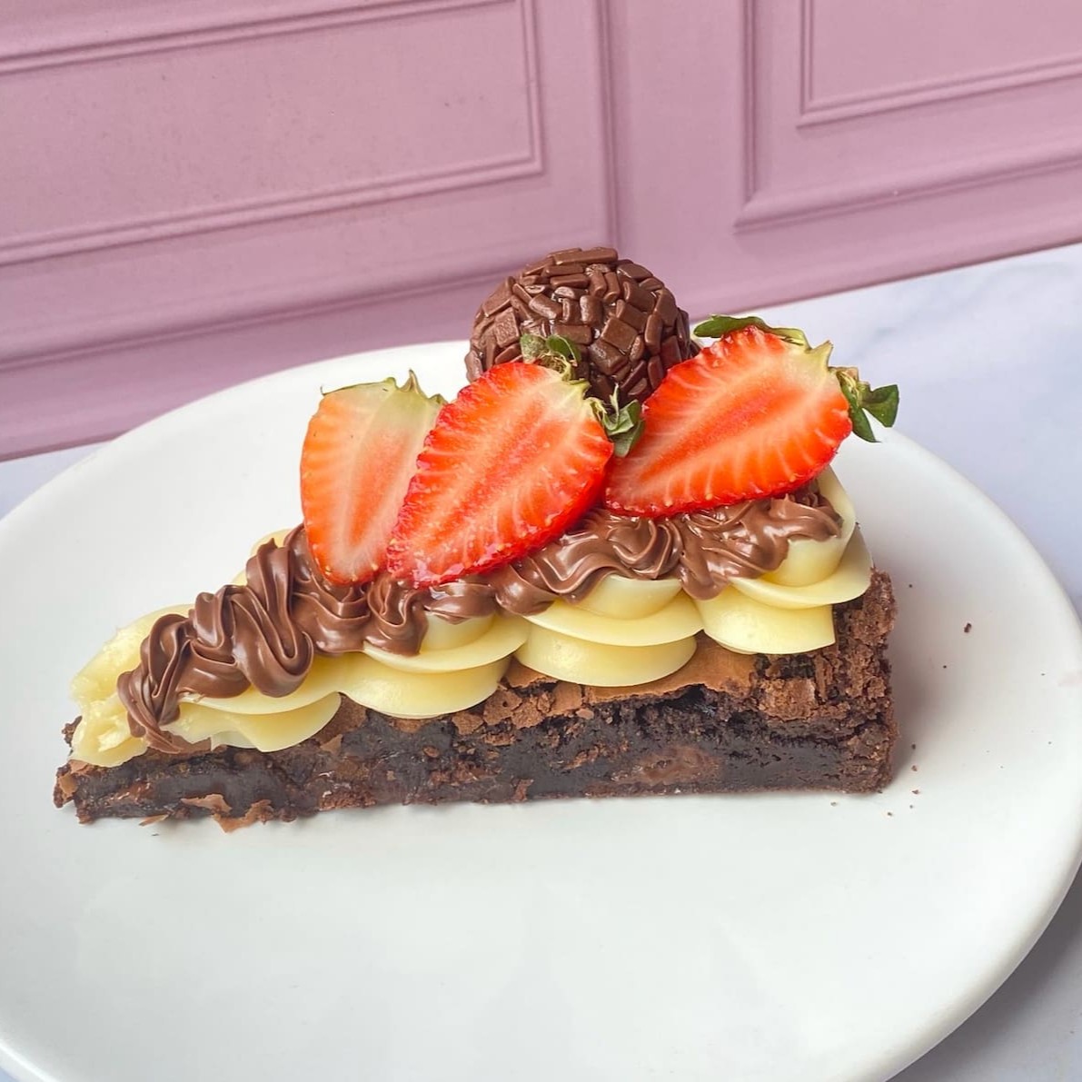 Brownie cremoso por dentro e com a casquinha crocante por fora, recheado com brigadeiro cremoso de Ninho, Nutella Pura e finalizado com morango.