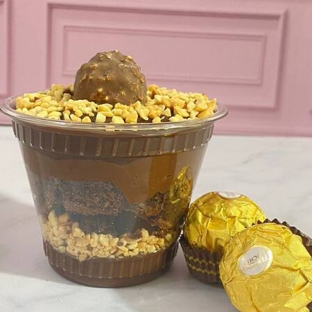 Camada de brigadeiro cremoso, Nosso Brownie que faz o maior sucesso, camada de Nutella pura, amendoim triturado e finalizado com um Ferrero Roche!