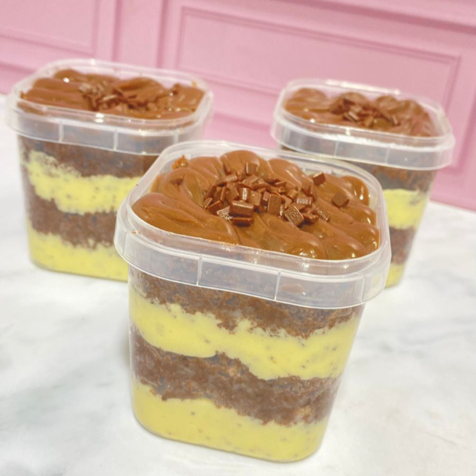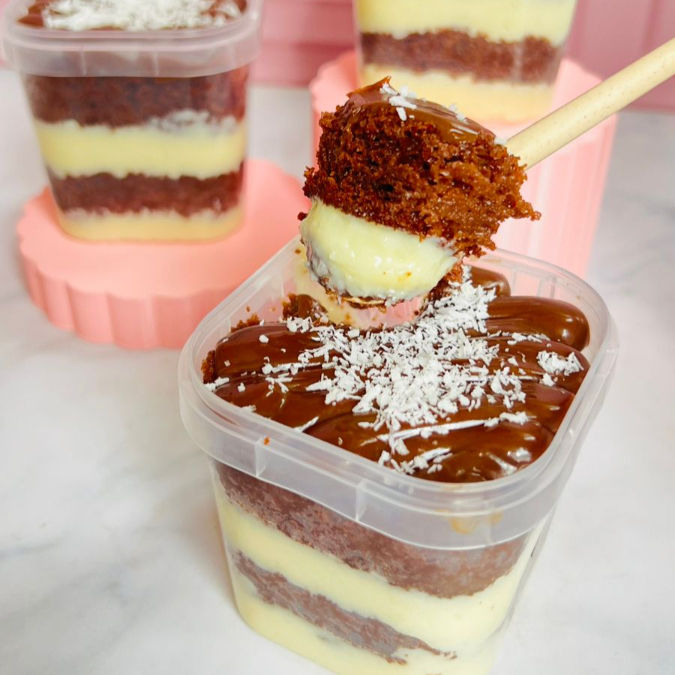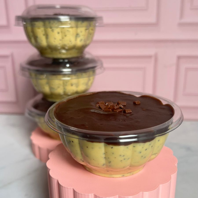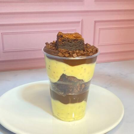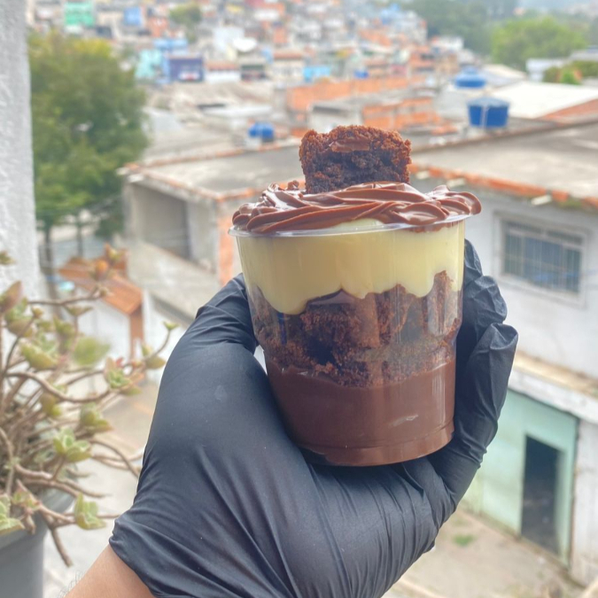 Camadas de Mousse de Maracujá, brigadeiro 50% cacau, pedaços de Brownie e granulado nobre.