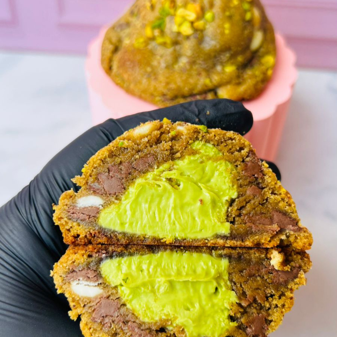 Cookies de Pistache, recheado com creme de pistache, finalizado com pistache puro triturado.