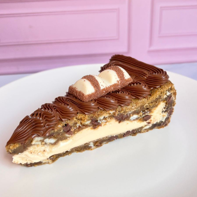 Massa cookies de baunilha com gotas de chocolate branco e ao leite, recheado com creme de kinder bueno puro, finalizado com nutella e kinder.
