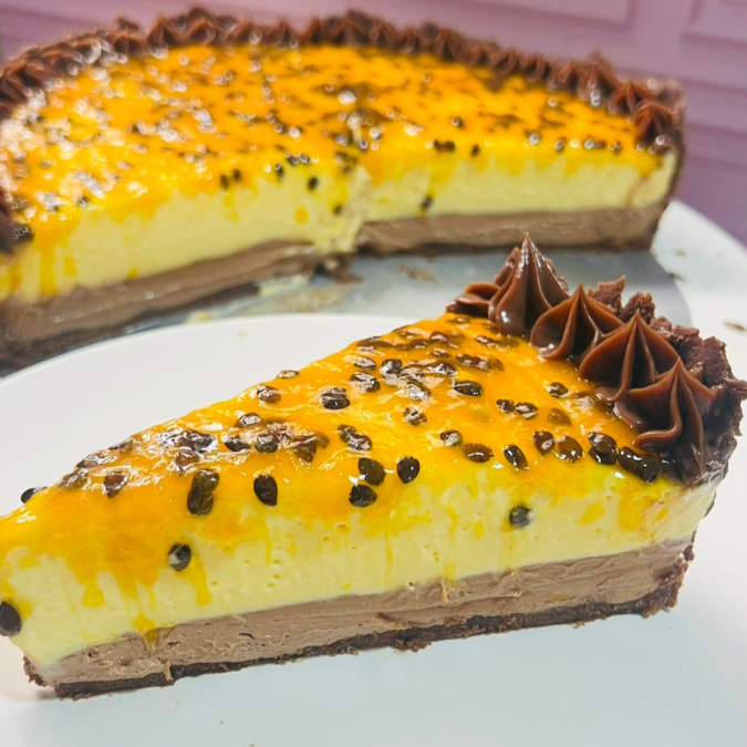Base de chocolate, com mousse de chocolate nobre, mousse de maracujá concentrado e uma deliciosa geleia de maracujá artesanal.