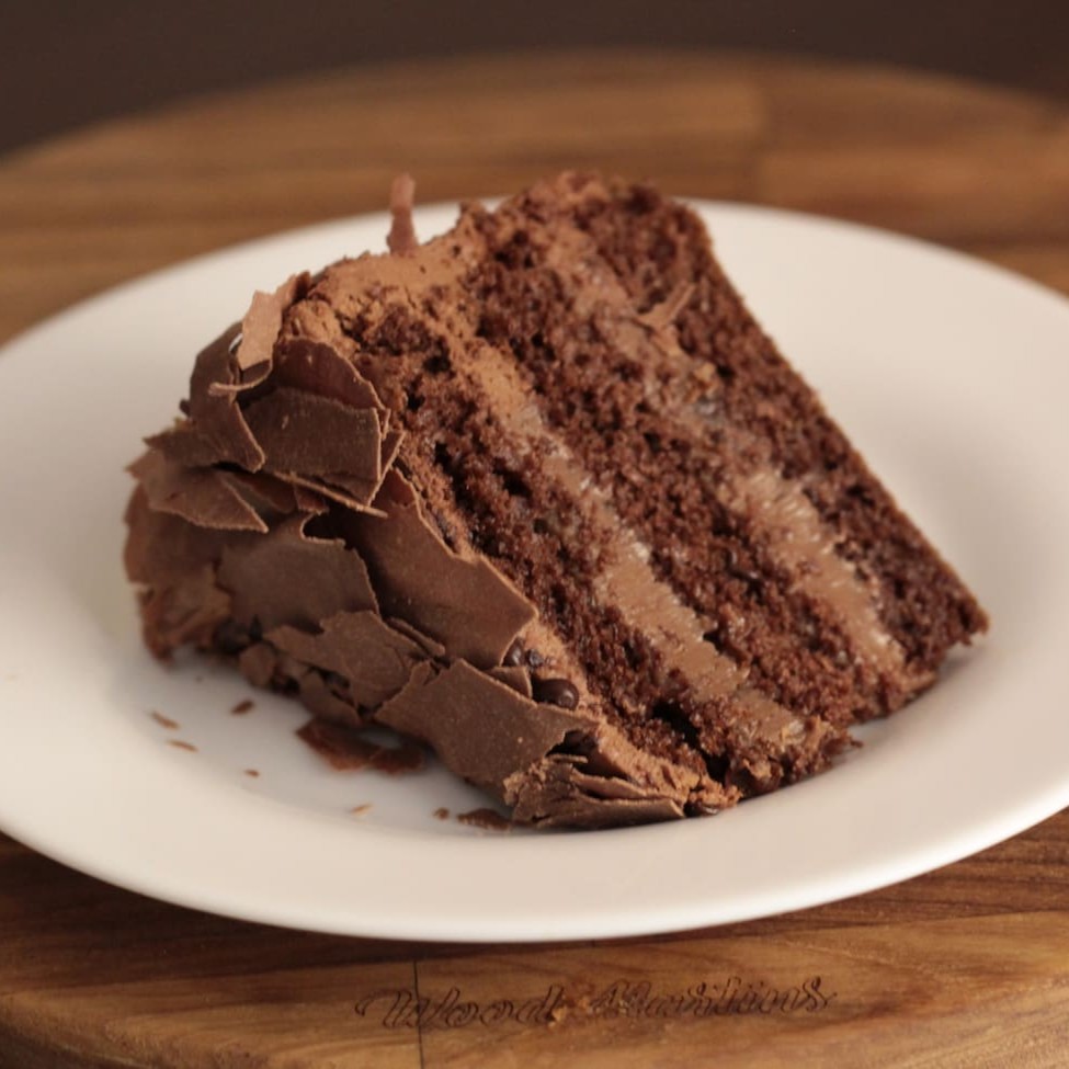 Fatia de aproximadamente 120g de bolo de brigadeiro com raspas de chocolate blend.