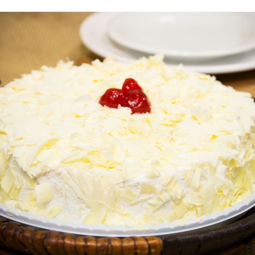 MASSA BRANCA,RECHEIO CREME DE LEITE NINHO E COB DE RASPAS DE CHOCOLATE BRANCO (RENDE 12 FATIAS)
