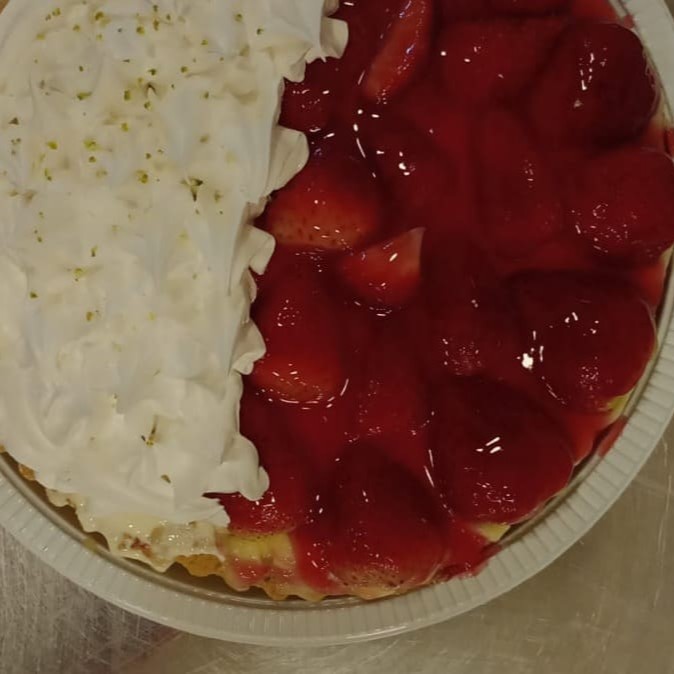 Uma saborosa torta de dois sabores, cuidadosamente dividida entre o cítrico do limão e o doce do morango. A base é composta por uma massa doce, macia e crocante, que complementa perfeitamente os recheios. No lado do limão, um creme aveludado e refrescante é a estrela, enquanto no lado do morango, um creme de baunilha suave acolhe pedaços de morangos frescos, adicionando uma explosão de sabor natur