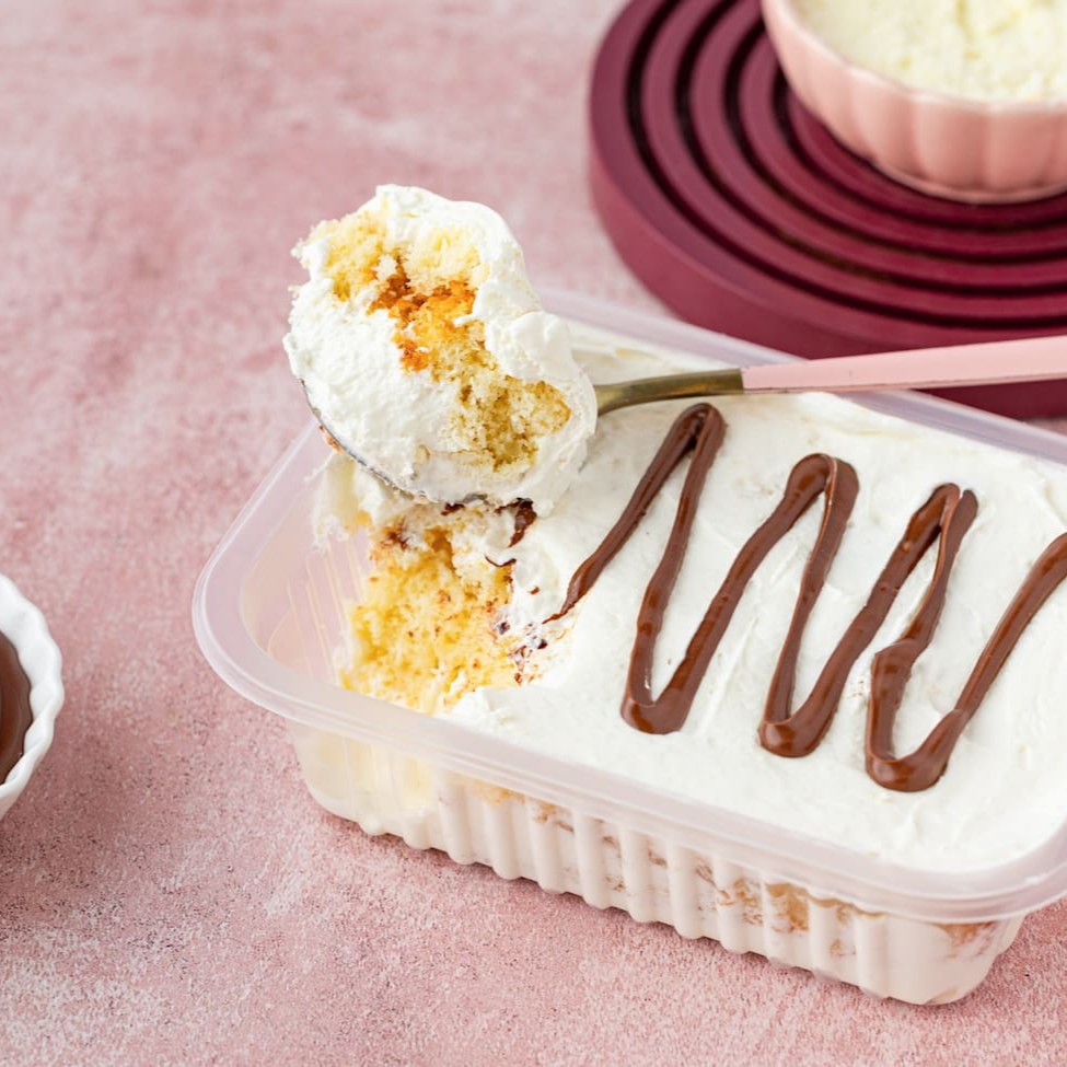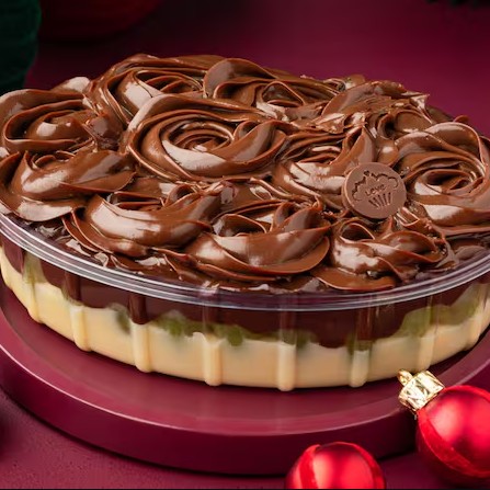 Massa branca, mousse Ninho e fios de Nutella. (O bolo de Ninho predomina o recheio de Ninho).