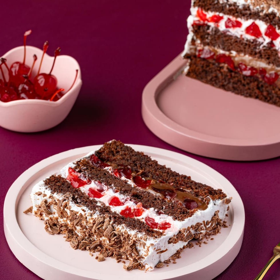 Fatia de Bolo - Brigadeiro com cerejas, Massa de cacau, chantilly com cerejas e raspas de chocolare nobre ao leite.