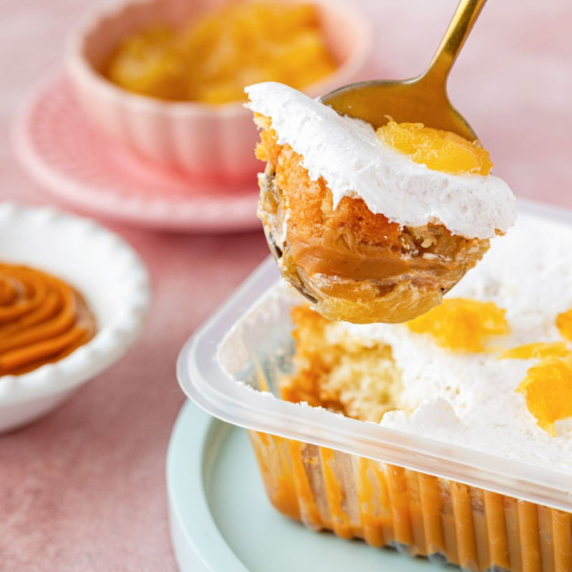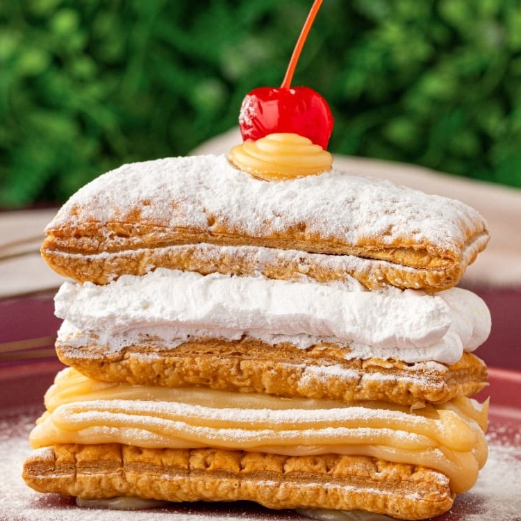 Massa folhada, brigadeiro de Leite Ninho, mousse 4 leites e açucar de confeiteiro.