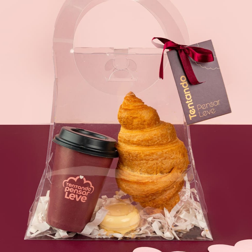 Bolsa transparente com laço e tag, com croissant, manteiga e copo tpl com solução de cappuccino.