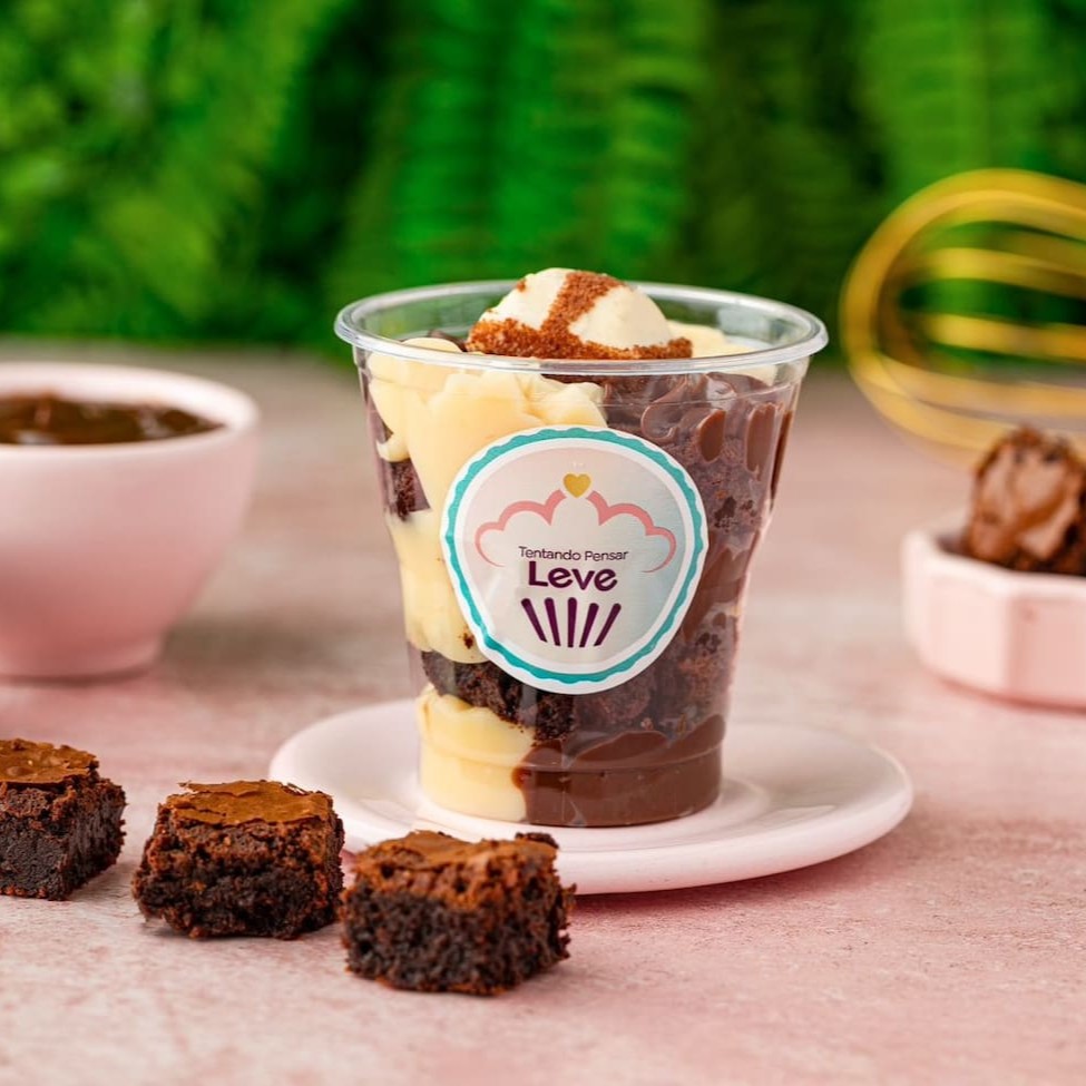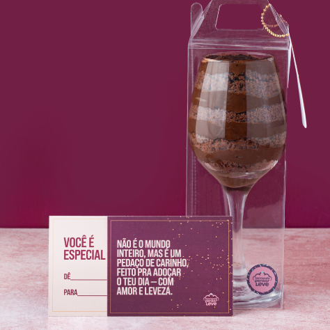 Um presente delicioso para celebrar o dia especial de quem vc ama ! Bolo de chocolate em camadas com recheio de brigadeiro Gourmet Montado em uma charmosa taça de vidro reutilizável . Acompanha um cartão para uma mensagem . Pronto para surpreender e adoçar a comemoração