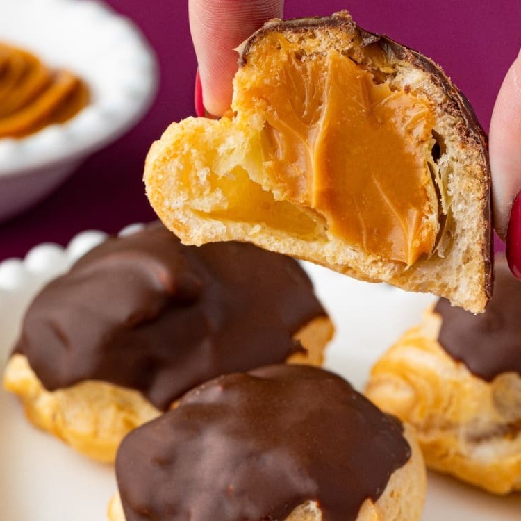 (Deliciosas Carolinas ) Massa choux recheada com delicoso doce de Leite e finalizada com chocolate meio amargo. 100gr