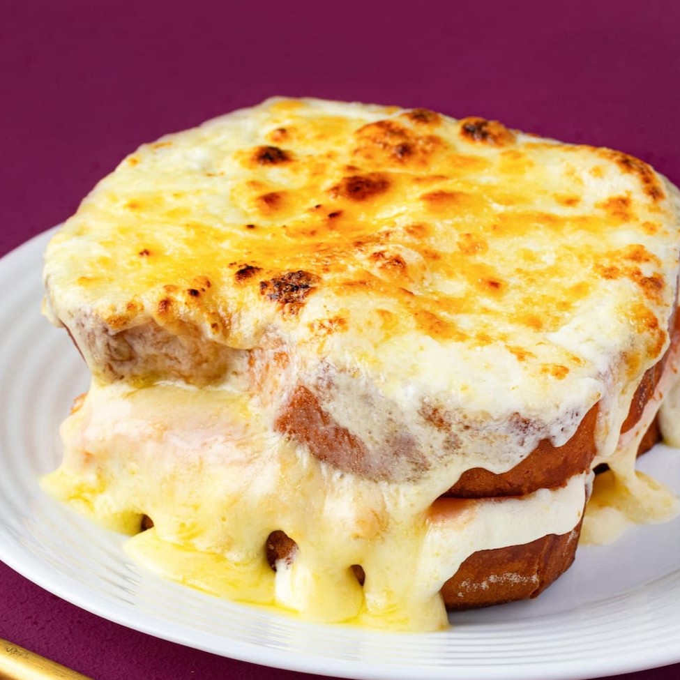 Pão Artesano, tostado na Manteiga com Presunto, Fior di Latte Mozzarela, molho Béchamel e Queijo gratinado.