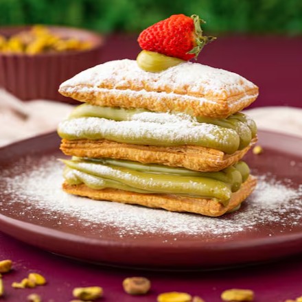 Massa Folhada Intercalada com Brigadeiro de Pistache e Morango Fresco na Finalização
