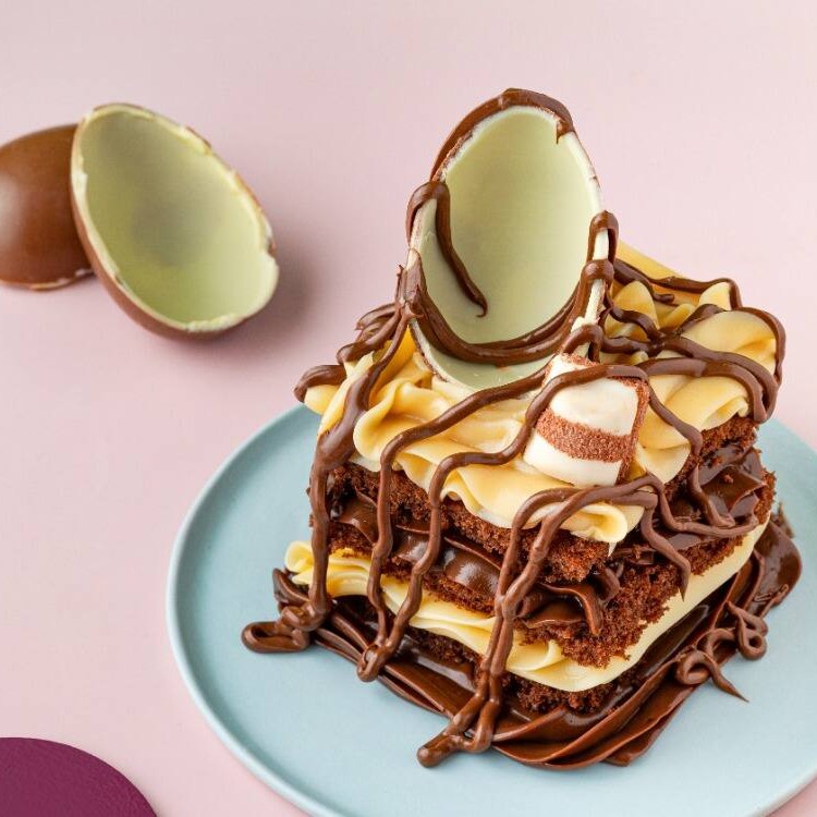 Massa de bolo cacau, brigadeiro Kinder, fio de Nutella.