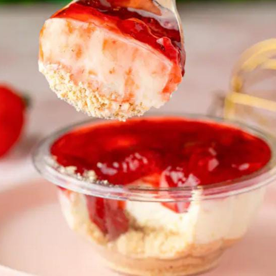 Cheesecake Cremoso com base de biscoito amanteigado, creme com cream chesee e cobertura generosa de geléia de morango artesanal