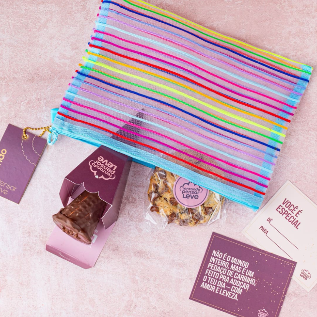 O presente perfeito para adoçar qualquer momento! Uma charmosa necessaire recheada com: 1 Bolsinha com Ziper 1 Cookie recheado de Nutella 1 Cone Brigadeiro Intenso 1 Cartão de presente para escrever sua mensagem especial Tudo embalado com muito carinho, pronto para surpreender quem você ama.