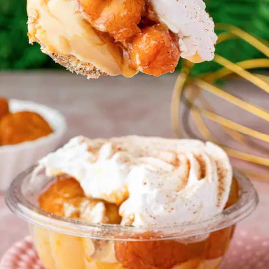 Farofa crocante , creme belga , banana caramelizada no ponto certo , chantilly leve e um toque de canela para finalizar