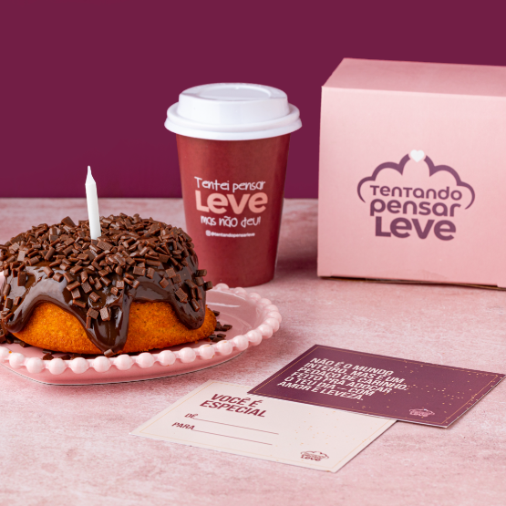 Transforme qualquer momento em uma Celebração! Nosso kit Doce Abraço contém um delicioso bolo de Cenoura com cobertura de brigadeiro , acompanhado de uma bebida quentinha de chocolate europeu, uma velinha para assoprar e uma linda embalagem personalizada Tentando Pensar Leve. Um presente perfeito para adoçar o dia de quem vc ama ou para se mimar com carinho e muito sabor