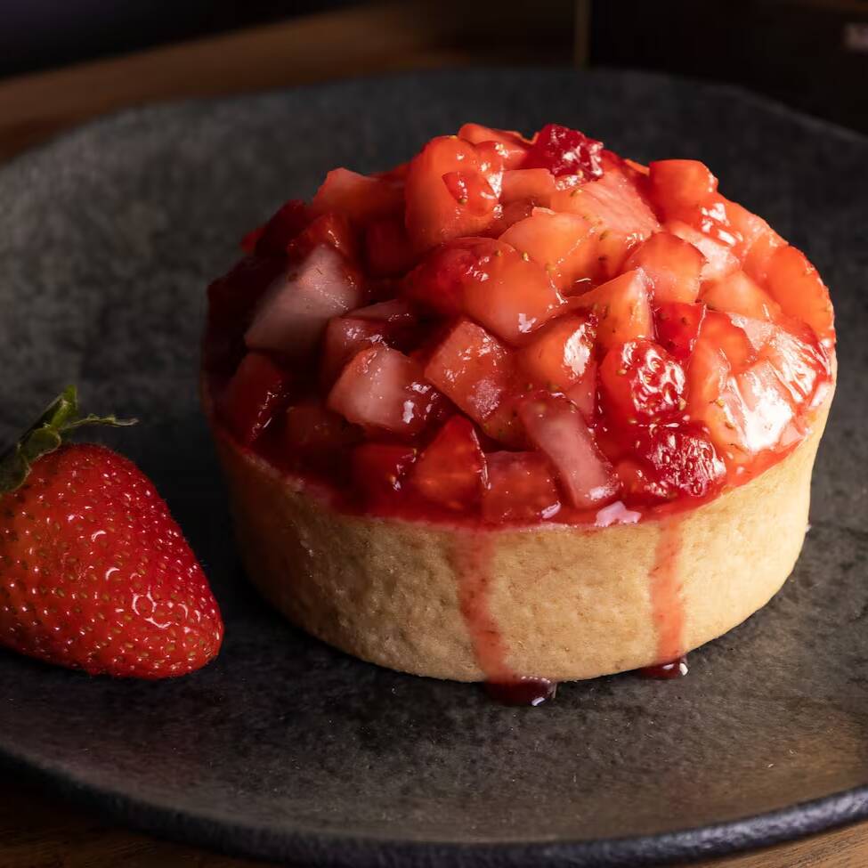 Deliciosa e crocante massa, creme branco da casa, coberto com tartar de morangos frescos.