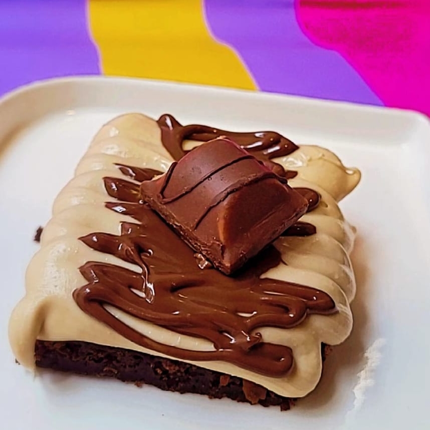 Quadrado de Brownie 6x6 110g - cobertura de Kinder Bueno, com Nutella finalizado com pedaço de Kinder Bueno