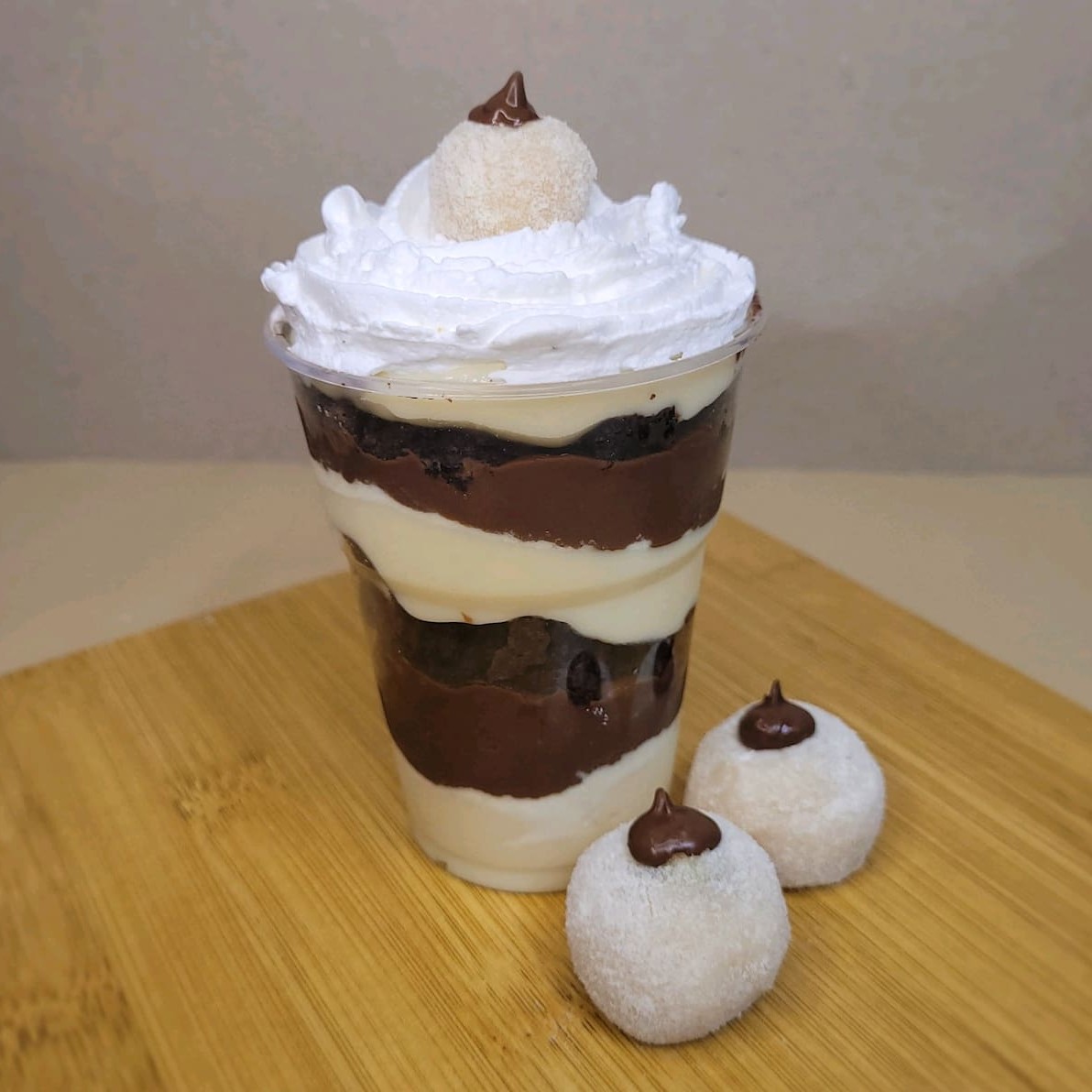 Voce vai se deliciar com esse copo, uma camada do mousse de Ninho, brigadeiro cremoso, brownie, brigadeiro branco, chantininho e para finalizar um pedacinho de brownie.