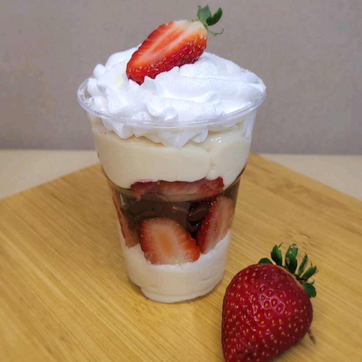 Uma generosa camada de brigadeiro chocolate, brownie, mousse chocolate, morangos, finalizando com chantilly chocolate e morango.