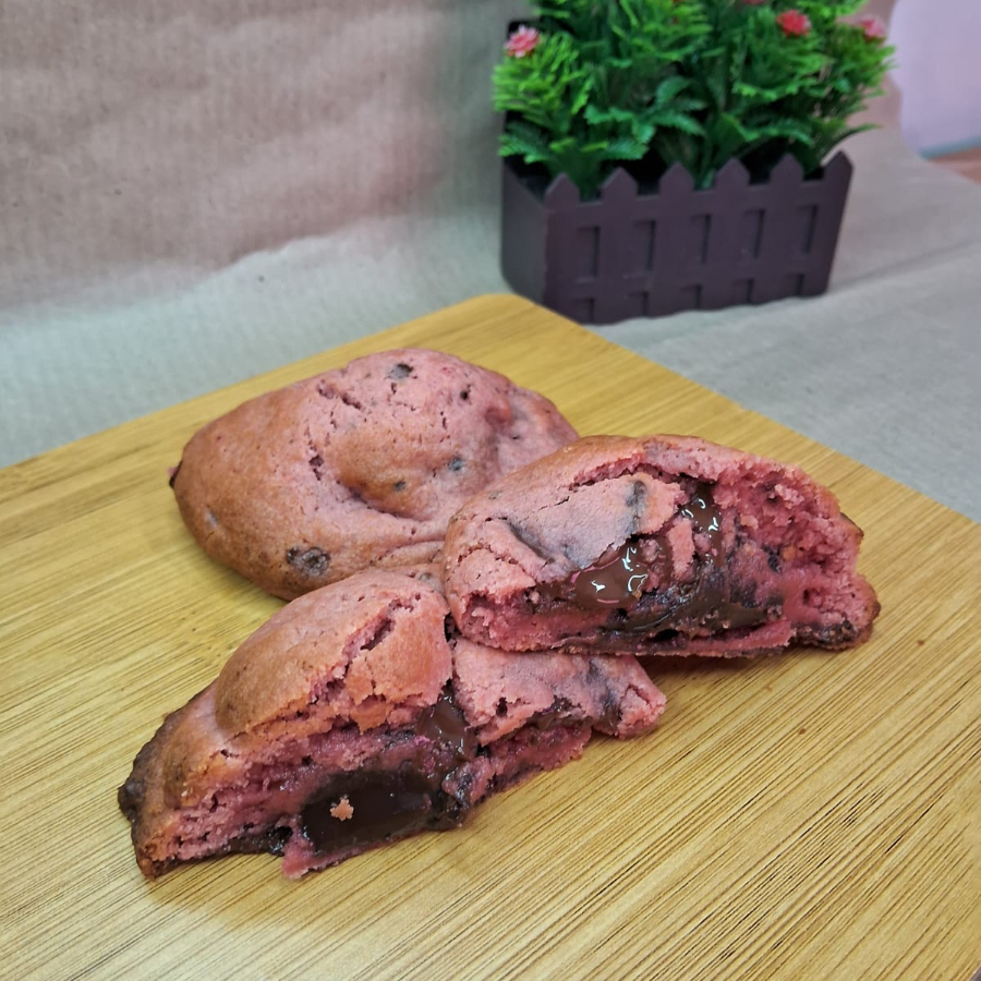 Delicioso cookie sabor morango, gotas de chocolate blend e recheio de brigadeiro