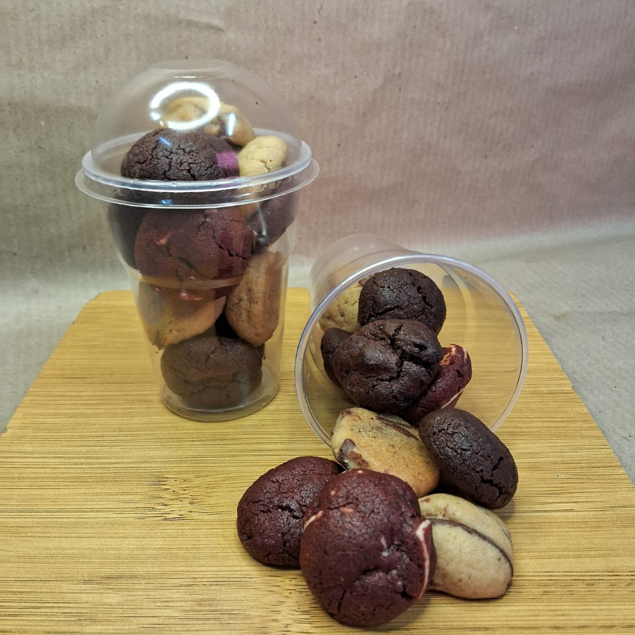 Copo com mini cookies nos sabores gotas de chocolate, redvelvet com gotas de chocolate branco e duo chocolate com gotas de chocolate blend 130 gramas