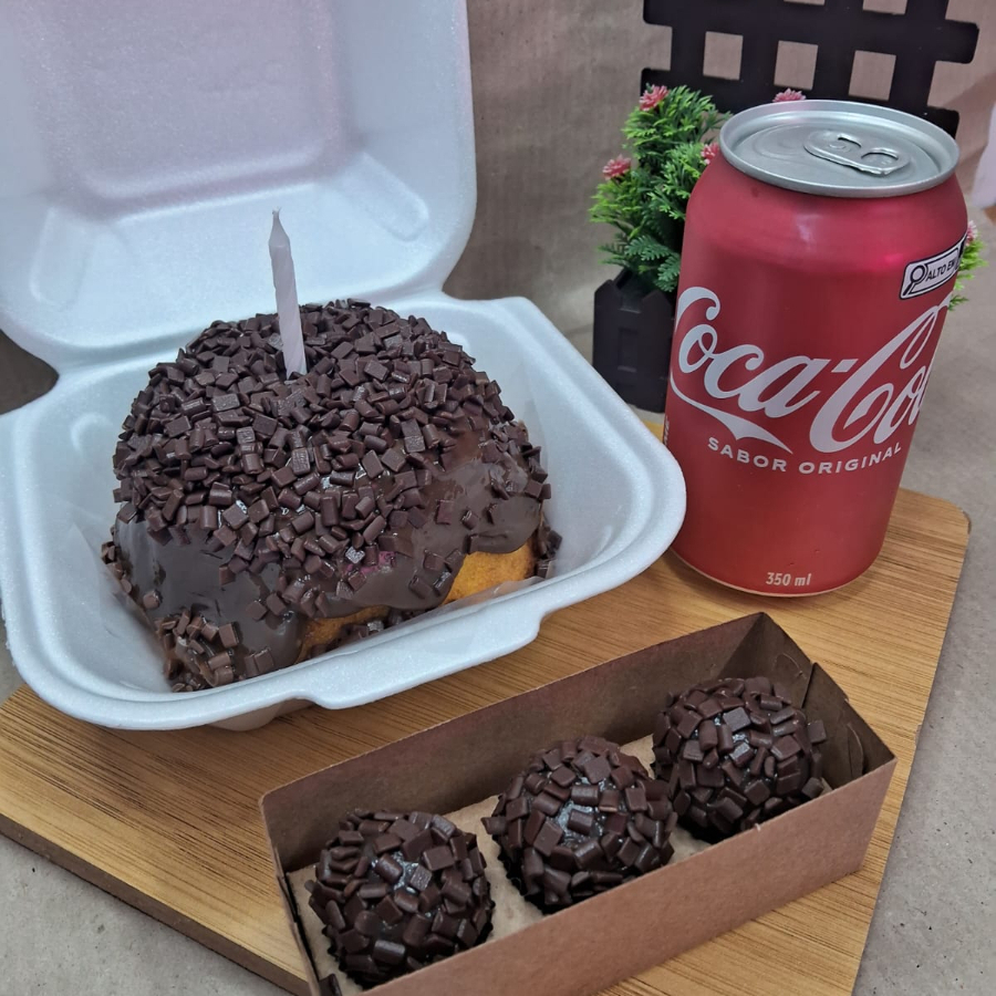 Mini Vulcão de Cenoura com brigadeiro e vela unitária, 3 brigadeiros gourmet e 1 coca cola original 350 mlgourmet