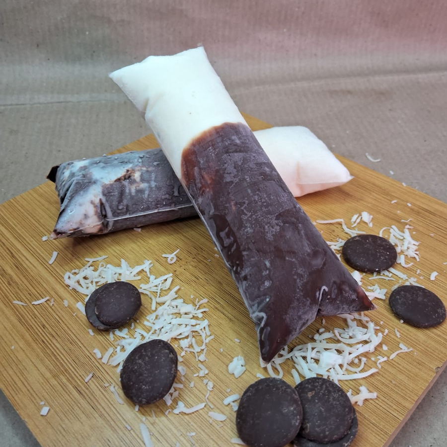 Refrescante geladinho de coco, com casquinha de chocolate blend
