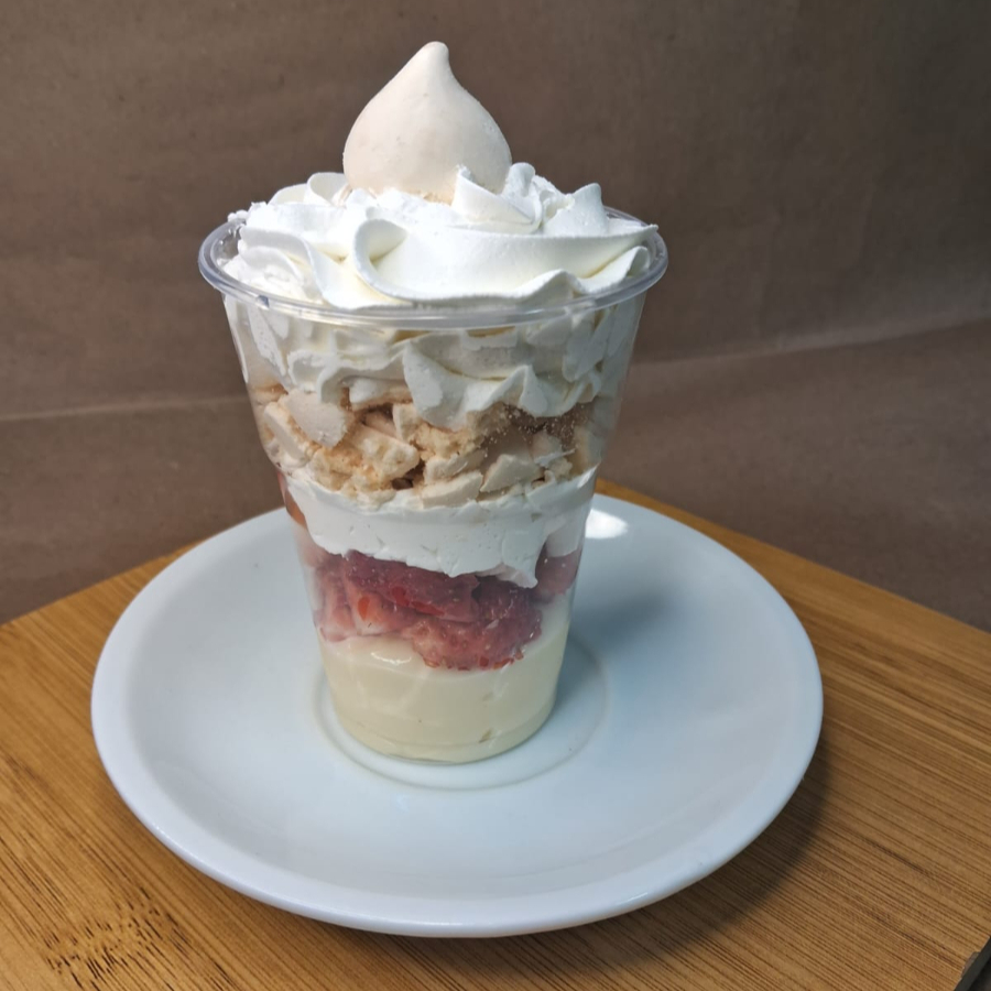 Começamos com uma base de brigadeiro branco que traz a doçura na medida certa, 2 camadas de morangos picados, suspiro e chantilly. Finalizando com um suspiro. Um copo doce e leve