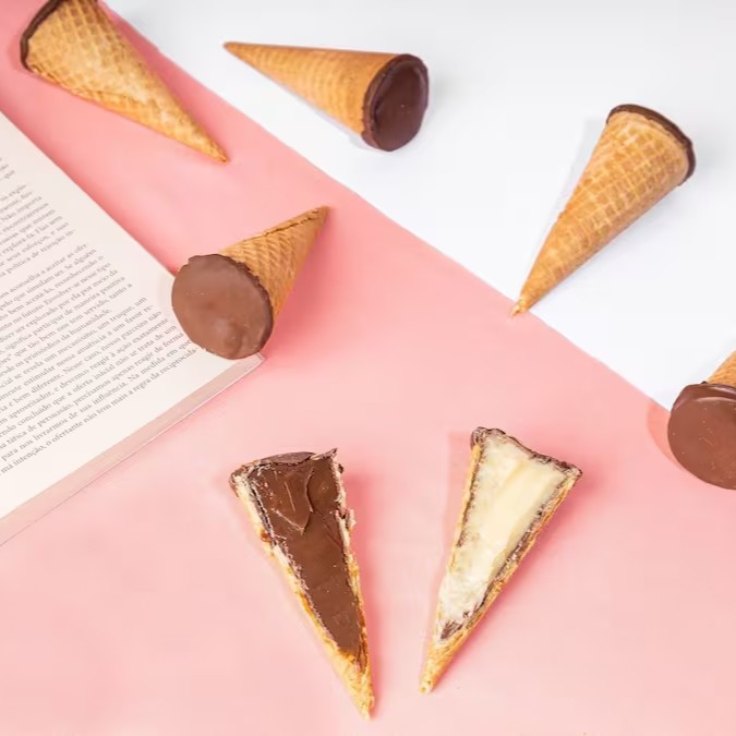 Cones recheados, casquinha crocante banhada no chocolate ao leite com recheios cremosos e feitos diariamente.