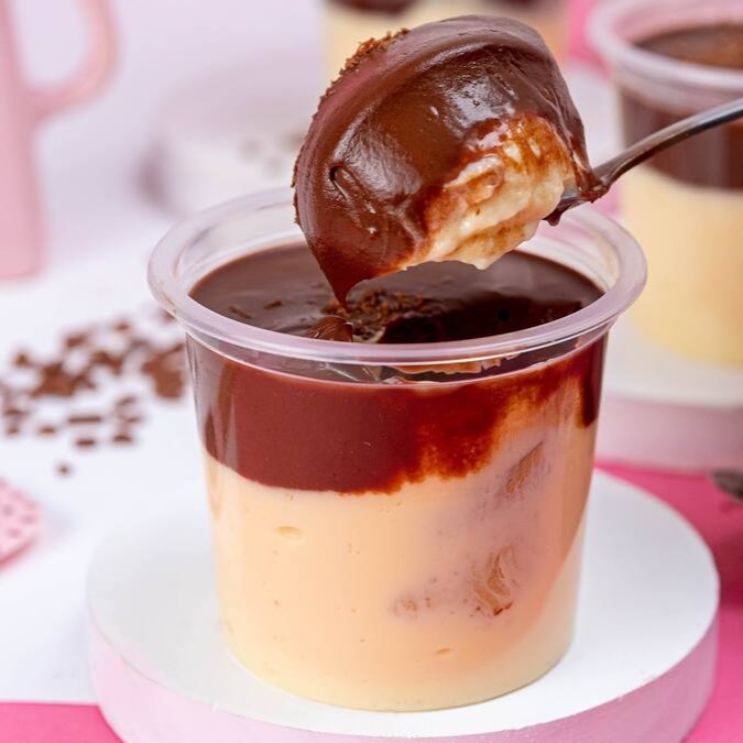 Massa fofinha de chocolate, com uma camada de creme belga ao leite e finalizado com brigadeiro de leite Ninho. Paixão a cada colherada.
