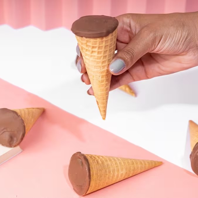 Cones trufados, casquinhas crocante banhada dentro e fora no chocolate ao leite ou branco com recheios e texturas exclusivas, feitos diariamente pra adoçar o seu Dia :).
