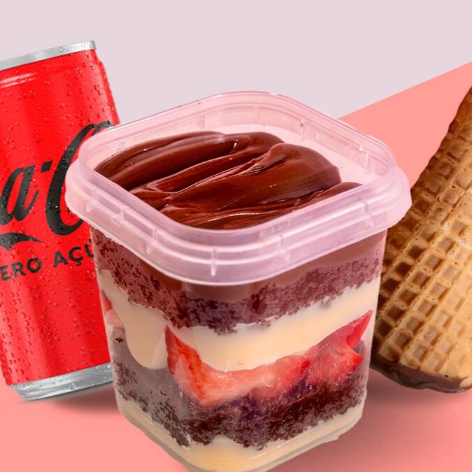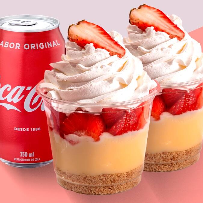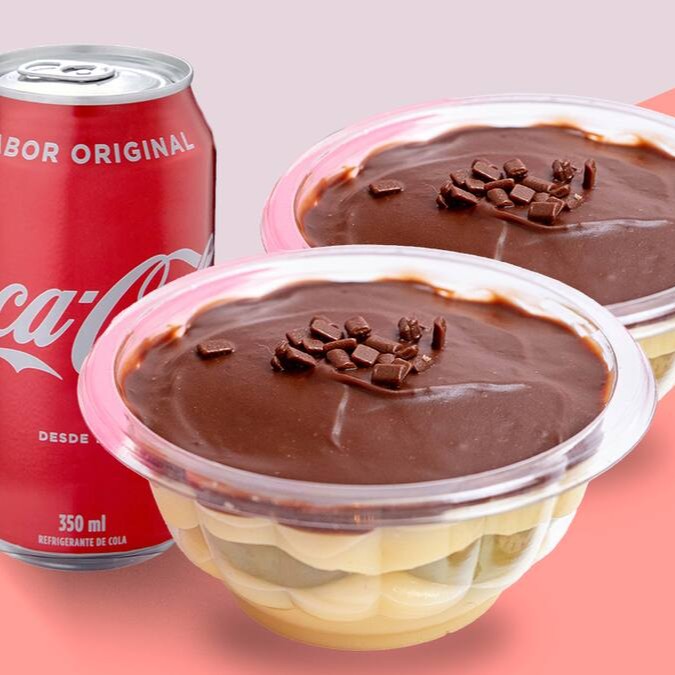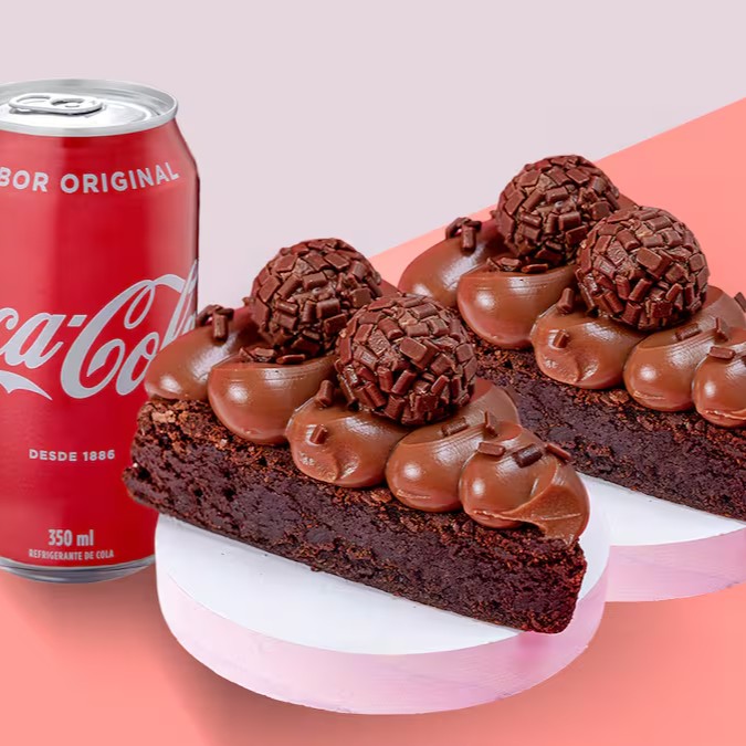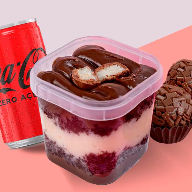O combo que é amor em cada detalhe: bolo no pote, brigadeiros e Coca-Cola gelada! Escolha 1 bolo, até 2 brigadeiros e 1 bebida.