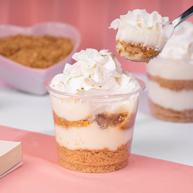 Deliciosa torta de limão no pote: massa de biscoito amanteigada com camadas intercaladas de mousse suave de limão, finalizada com chantilly e raspas de limão - 210ml.