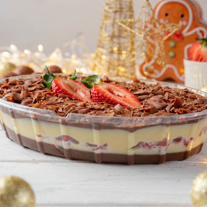 Saboreie a tentação em cada camada, massa fofinha de chocolate e morangos frescos, com deliciosos recheios de Leite Ninho e brigadeiro 220ml.