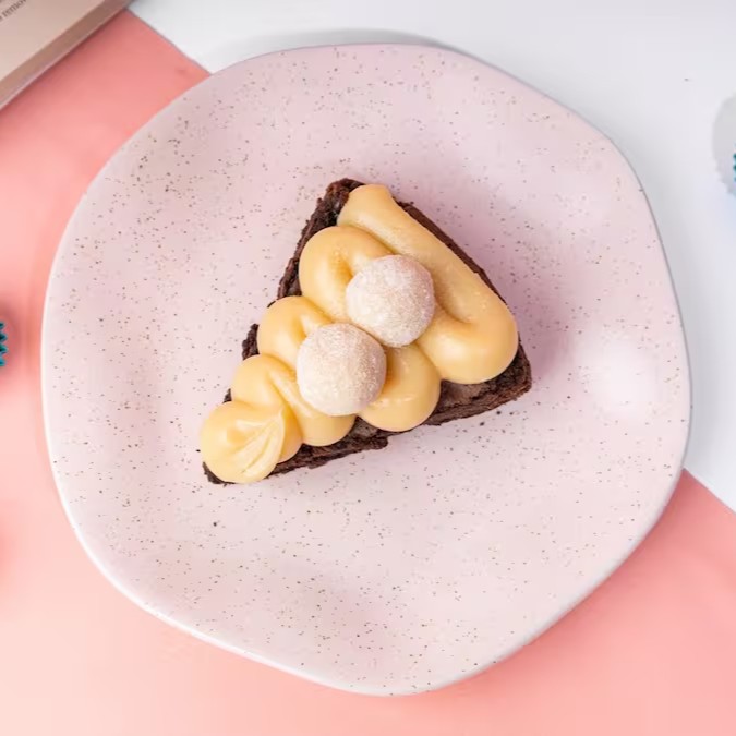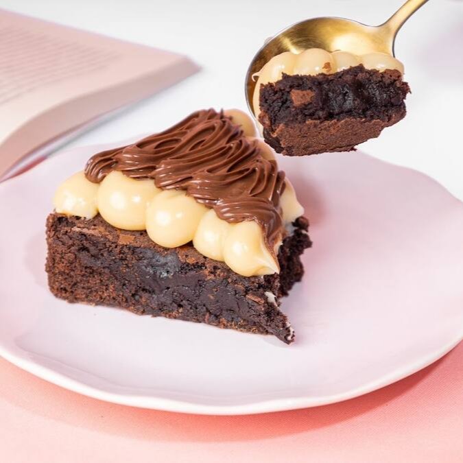 Fatia de brownie meio amargo, macio por dentro com uma casquinha crocante por fora com recheio de brigadeiro de Ninho cremoso, com Nutella pura por cima :).