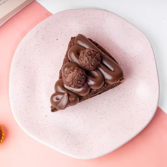 Fatia de brownie meio amargo, macio por dentro com casquinha crocante e recheio de brigadeiro cremoso :) Finalizada com 2 brigadeiros.200g.
