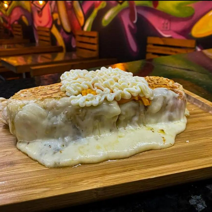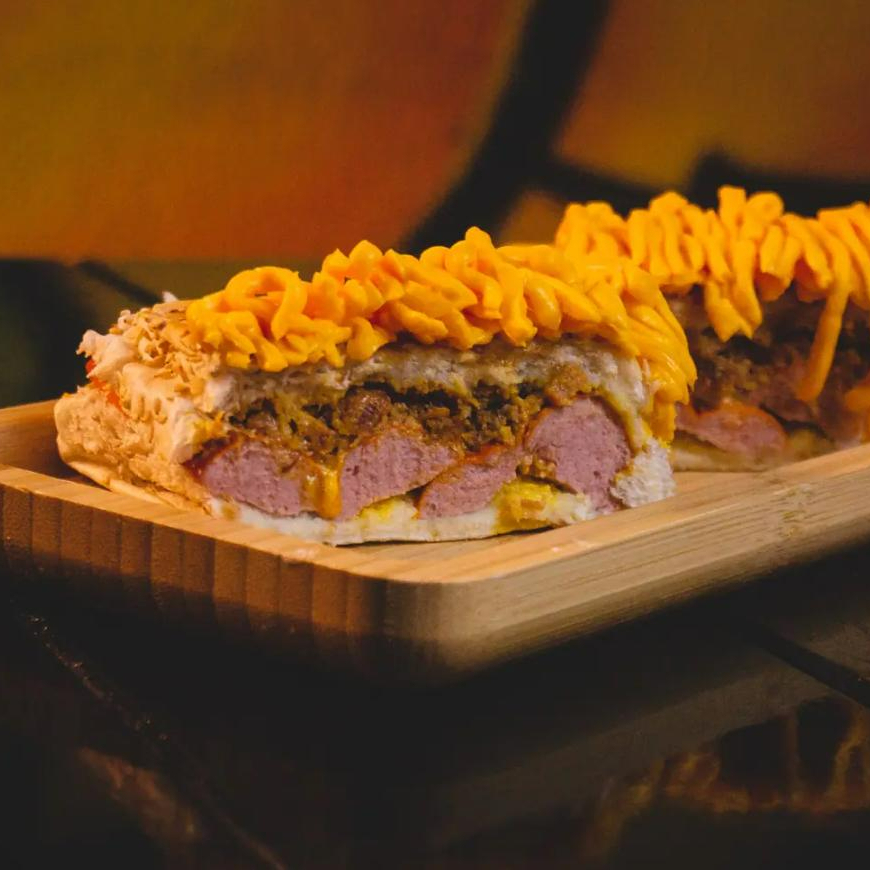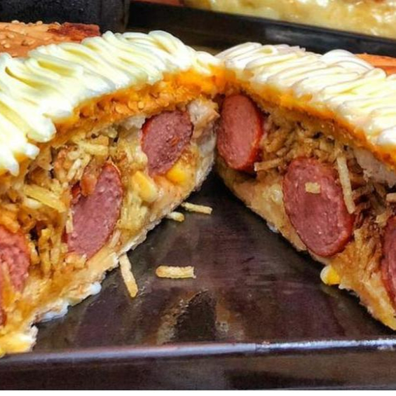Pão com parmesão, 2 salsichas, Catupiry, cheddar, calabresa, frango, bacon, milho, ervilha, barbecue, ketchup, purê, mostarda, mostarda, batata palha, maionese
