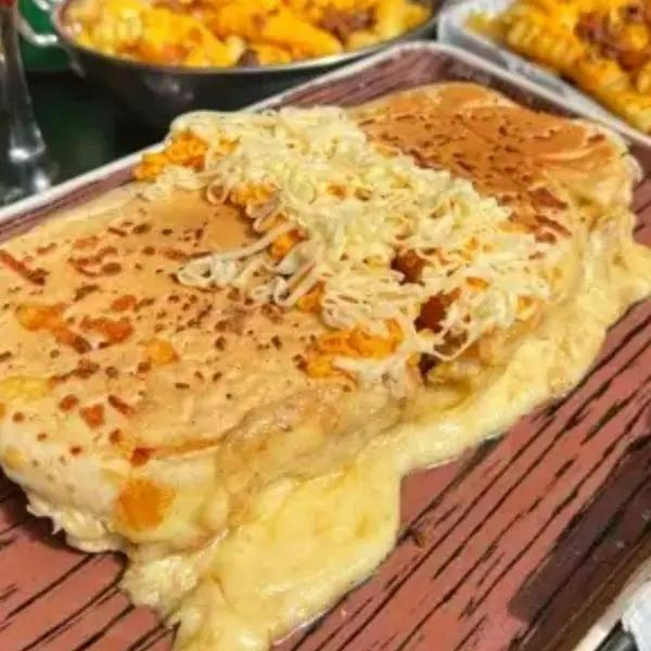 Pão com parmesão 2 salsichas, purê, milho, ervilha,bacon fatiado, cheddar, maionese, catchup, mostarda, batata palha