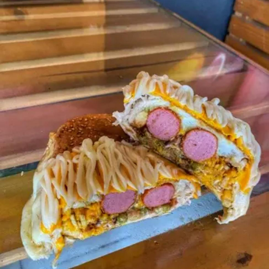 Pão com parmesão , 2 salsichas, calabresa, cream cheese, bacon, Catupiry, milho, ervilha, azeitona, purê, mostarda, ketchup,maionese,barbecue,batata palha.